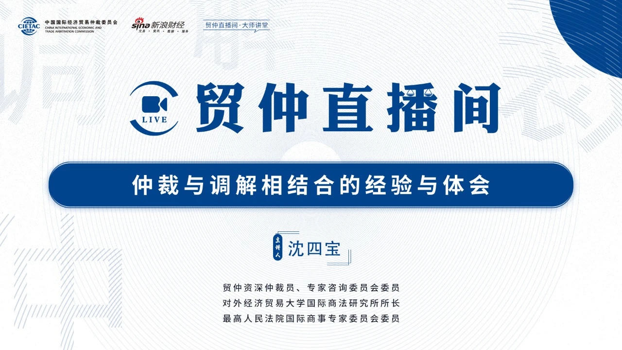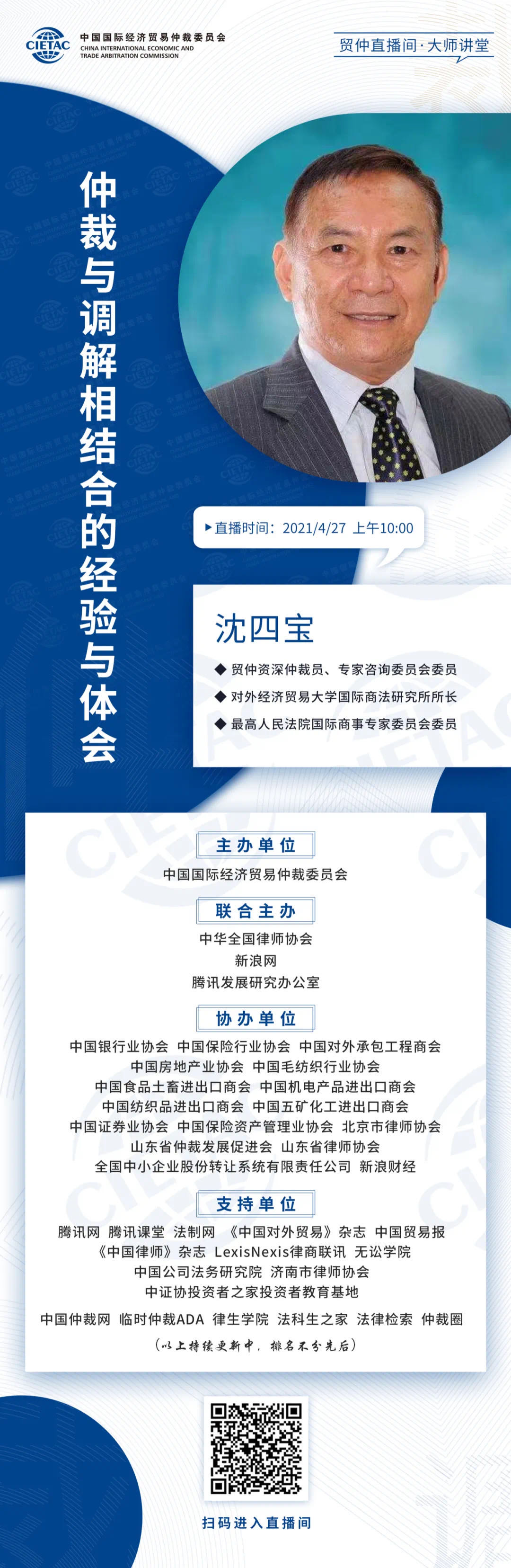 貿(mào)仲直播間-大師講堂系列課程第三講將于2021年4月27日(星期二)上午10時(shí)邀請貿(mào)仲資深仲裁員、專家咨詢委員會委員,對外經(jīng)濟(jì)貿(mào)易大學(xué)國際商法研究所所長,最高人民法院國際商事專家委員會委員沈四寶教授,講解“仲裁與調(diào)解相結(jié)合的經(jīng)驗(yàn)與體會”。