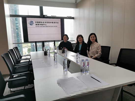 (自左向右:貿(mào)仲海南仲裁中心秘書(shū)長(zhǎng)王文英、獨(dú)任仲裁員岳潔、案件經(jīng)辦人余婷)