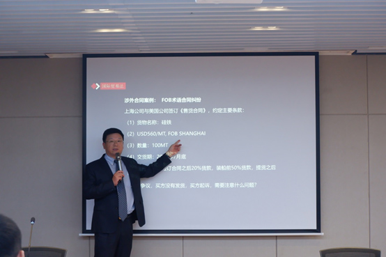 張振安律師以 “涉外經(jīng)貿(mào)合同法律風(fēng)險(xiǎn)和爭(zhēng)議解決”為題進(jìn)行了發(fā)言。他首先通過(guò)介紹一起真實(shí)案例,引出國(guó)際貨物貿(mào)易合同條款中當(dāng)事雙方可能忽略的問(wèn)題。接著,梳理了國(guó)際貨物貿(mào)易合同的簽訂流程,對(duì)每一環(huán)節(jié)可能存在的風(fēng)險(xiǎn)點(diǎn)進(jìn)行了逐一講解,并結(jié)合我國(guó)民法典、國(guó)際貿(mào)易術(shù)語(yǔ)解釋通則(INCOTERMS)、聯(lián)合國(guó)國(guó)際貨物銷售合同公約(CISG)和跟單信用證統(tǒng)一慣例(UCP600),從國(guó)內(nèi)和國(guó)際兩個(gè)層面,對(duì)企業(yè)規(guī)避簽訂涉外貨物買賣合同過(guò)程中的風(fēng)險(xiǎn)給出了建議。最后,張律師通過(guò)對(duì)比仲裁與訴訟的區(qū)別,對(duì)仲裁作為爭(zhēng)議解決方式之一在國(guó)際貿(mào)易領(lǐng)域的優(yōu)勢(shì)進(jìn)行了詳細(xì)說(shuō)明,并向現(xiàn)場(chǎng)參會(huì)者推薦了貿(mào)仲江蘇中心的示范仲裁條款。
