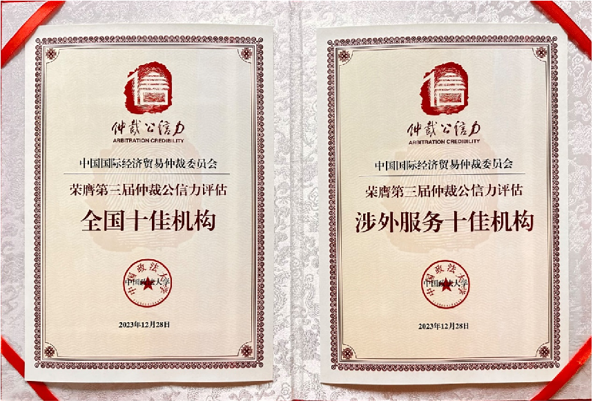 2023年12月28日,在北京舉辦的仲裁公信力評估報告發(fā)布會暨第三屆仲裁公信力論壇上,中國國際經(jīng)濟貿(mào)易仲裁委員會(以下簡稱“貿(mào)仲”)獲評“全國十佳仲裁機構”和“涉外服務十佳仲裁機構”雙十佳獎項。本屆仲裁公信力評估圍繞“仲裁公信力指數(shù)”和“涉外仲裁服務指數(shù)”開展,貿(mào)仲兩項指標分別達90分和98分,位居雙十佳首位,再獲殊榮,仲裁公信力、涉外服務優(yōu)勢獲得廣泛認可。
