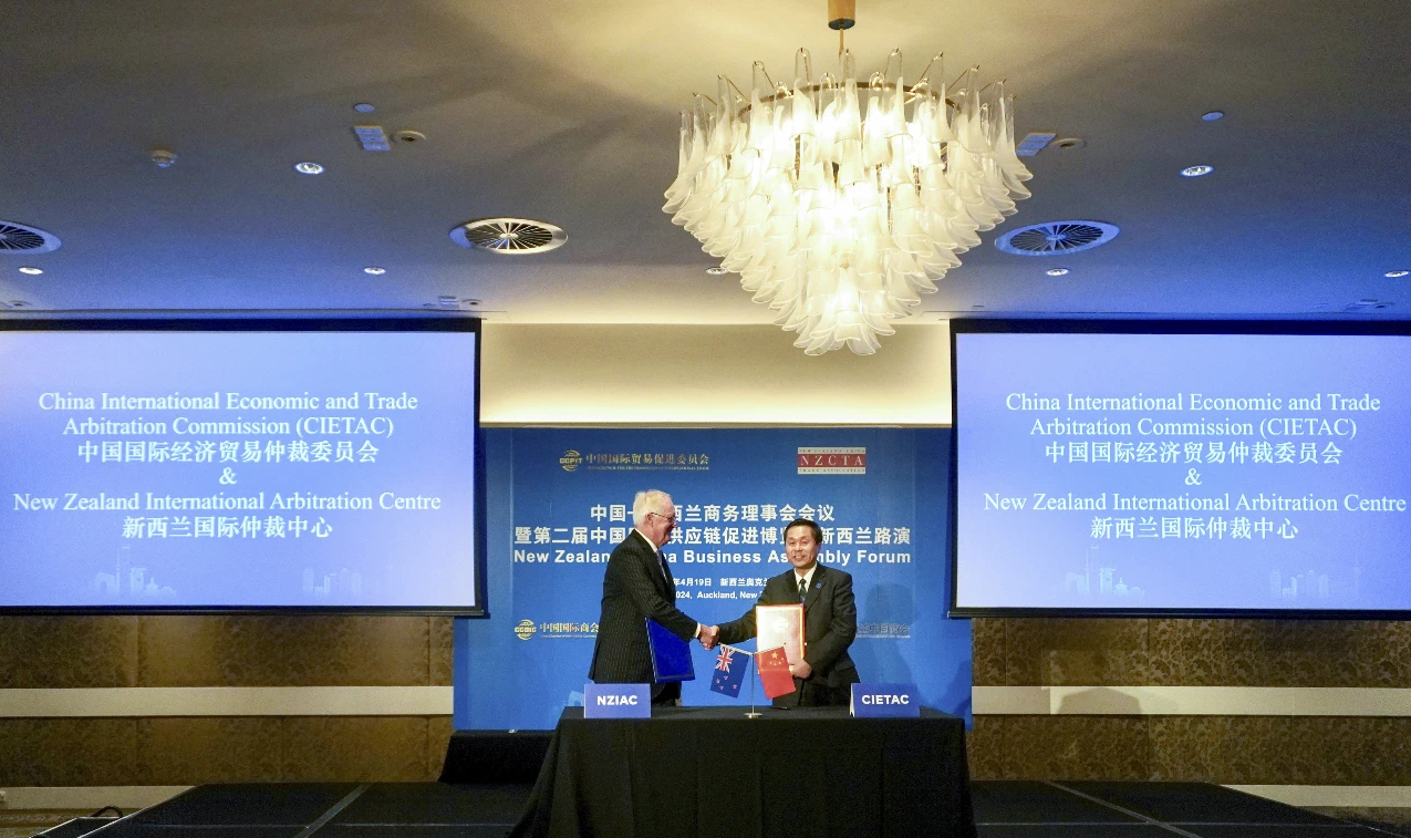 4月19日,在中國貿促會會長任鴻斌率中國企業(yè)家代表團訪問新西蘭期間,中國國際經(jīng)濟貿易仲裁委員會副主任兼秘書長王承杰與新西蘭國際仲裁中心主任約翰·格林在奧克蘭于第五屆中國—新西蘭商務理事會會議上簽署合作協(xié)議。中國貿促會會長任鴻斌、新西蘭中國貿易協(xié)會主席約翰·考克倫、中國駐新西蘭大使王小龍等出席簽約儀式。