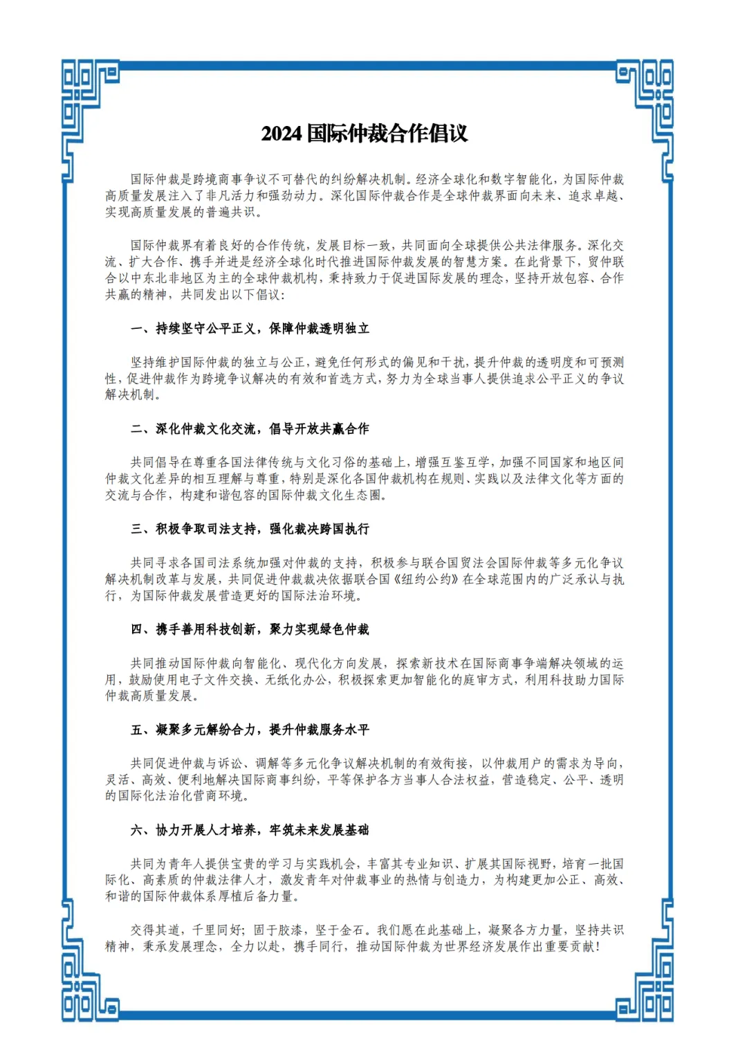 有鑒于此,貿(mào)仲在今年正式形成了《2024國際仲裁合作倡議》(以下簡稱《倡議》),并值高峰論壇舉辦之際在9月25日組織召開了中國-中東北非仲裁機(jī)構(gòu)對(duì)話會(huì),對(duì)《倡議》文本進(jìn)行進(jìn)一步討論,獲熱烈響應(yīng)并一致通過。《倡議》指出,國際仲裁是跨境商事爭議不可替代的糾紛解決機(jī)制。為促進(jìn)國際仲裁發(fā)展,國際仲裁界應(yīng)加強(qiáng)緊密聯(lián)系與通力合作:持續(xù)堅(jiān)守公平正義,保障仲裁透明獨(dú)立;深化仲裁文化交流,倡導(dǎo)開放共贏合作;積極爭取司法支持,強(qiáng)化裁決跨國執(zhí)行;攜手善用科技創(chuàng)新,聚力實(shí)現(xiàn)綠色仲裁;凝聚多元解紛合力,提升仲裁服務(wù)水平;協(xié)力開展人才培養(yǎng),牢筑未來發(fā)展基礎(chǔ)。