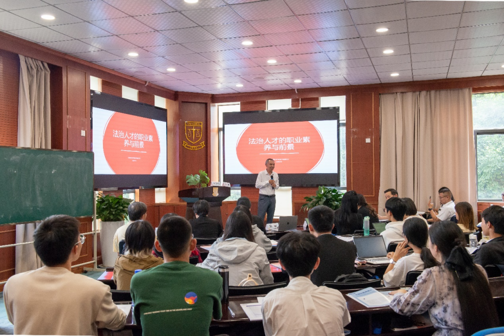 原美的集團(tuán)全球法務(wù)總監(jiān)、貿(mào)仲仲裁員陳敏作專題演講。陳敏談到,法治人才的職業(yè)素養(yǎng)并不是一種知識(shí),而是一種訓(xùn)練,法學(xué)院的學(xué)生應(yīng)當(dāng)具備的職業(yè)素養(yǎng)包括樹立證據(jù)意識(shí)、做事留痕、具備批判思維和審慎品質(zhì)等。法治人才的難得在于不但需要有扎實(shí)的法律知識(shí),還需要具備更多其他行業(yè)的基礎(chǔ)知識(shí),必須有意識(shí)地突破自己的職業(yè)局限,多方面培養(yǎng)自己的知識(shí)體系。他還以網(wǎng)絡(luò)熱詞為例,談?wù)摿四壳暗纳鐣?huì)就業(yè)情況及學(xué)子們進(jìn)入職場(chǎng)后可能會(huì)遇到的問題,并給出了解決方式和建議。最后,他以“主動(dòng)權(quán),決定生存權(quán)”作為結(jié)束語,呼吁學(xué)子們厚積薄發(fā),主動(dòng)把握未來。