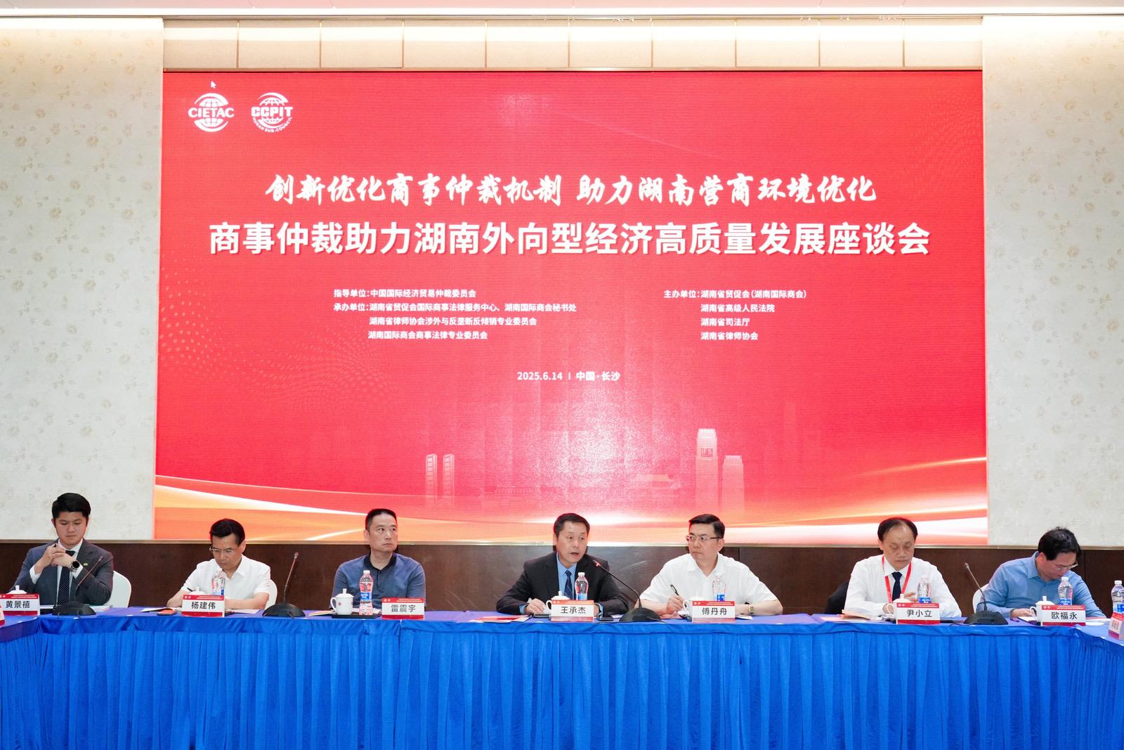 6月14日,商事仲裁助力湖南外向型經(jīng)濟(jì)高質(zhì)量發(fā)展座談會在湖南省長沙市成功舉辦。本次座談會由中國國際經(jīng)濟(jì)貿(mào)易仲裁委員會(簡稱貿(mào)仲)指導(dǎo),湖南省貿(mào)促會(湖南國際商會)、湖南省高級人民法院、湖南省司法廳、湖南省律師協(xié)會共同主辦。貿(mào)仲副主任兼秘書長王承杰、湖南省司法廳副廳長雷震宇、湖南省高級人民法院審判委員會專職委員尹小立、湖南省律師協(xié)會會長楊建偉、澳門法律交流協(xié)進(jìn)會會長黃景禧以及湖南師范大學(xué)法學(xué)院副院長歐福永參加座談會并講話。湖南省貿(mào)促會黨組成員、副會長傅丹舟主持座談會。來自湖南省重點涉外企業(yè)及律師事務(wù)所的負(fù)責(zé)人和資深專家以及來自政府部門、行業(yè)協(xié)會、高校共40余位代表參加了座談會。