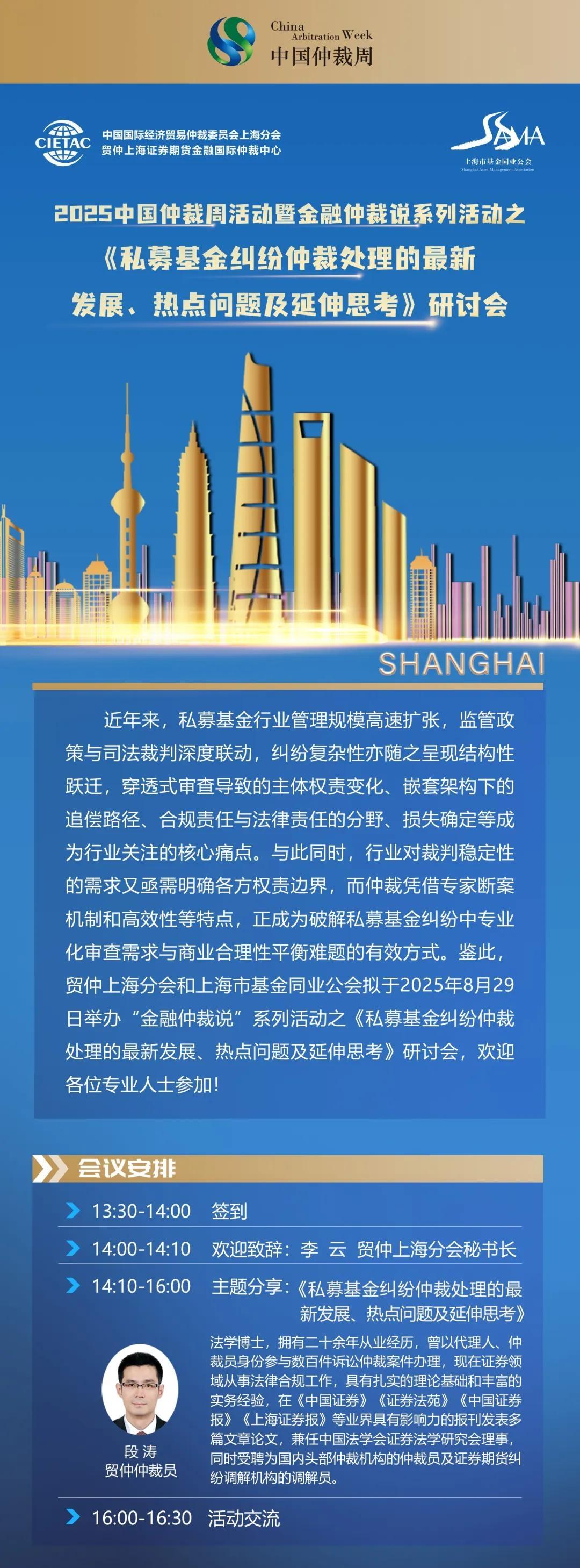 由中國國際經(jīng)濟貿(mào)易仲裁委員會等單位聯(lián)合發(fā)起的2025年第十三屆中國仲裁周即將拉開帷幕。為進一步提升中國仲裁周活動平臺專業(yè)價值與全球影響力,貿(mào)仲上海分會和上海市基金同業(yè)公會將于2025年8月29日舉辦2025中國仲裁周活動暨金融仲裁說系列活動之《私募基金糾紛仲裁處理的最新發(fā)展、熱點問題及延伸思考》研討會,期待各位嘉賓報名參與。