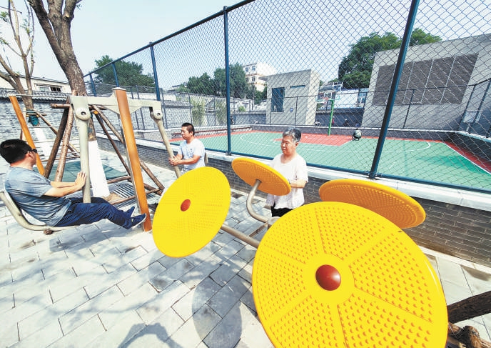 走出平安里地鐵站,原本空曠的街邊廣場(chǎng)座椅與健身器材錯(cuò)落有致,街道空間真正變成了居民的“城市客廳”。 本報(bào)記者 方非攝