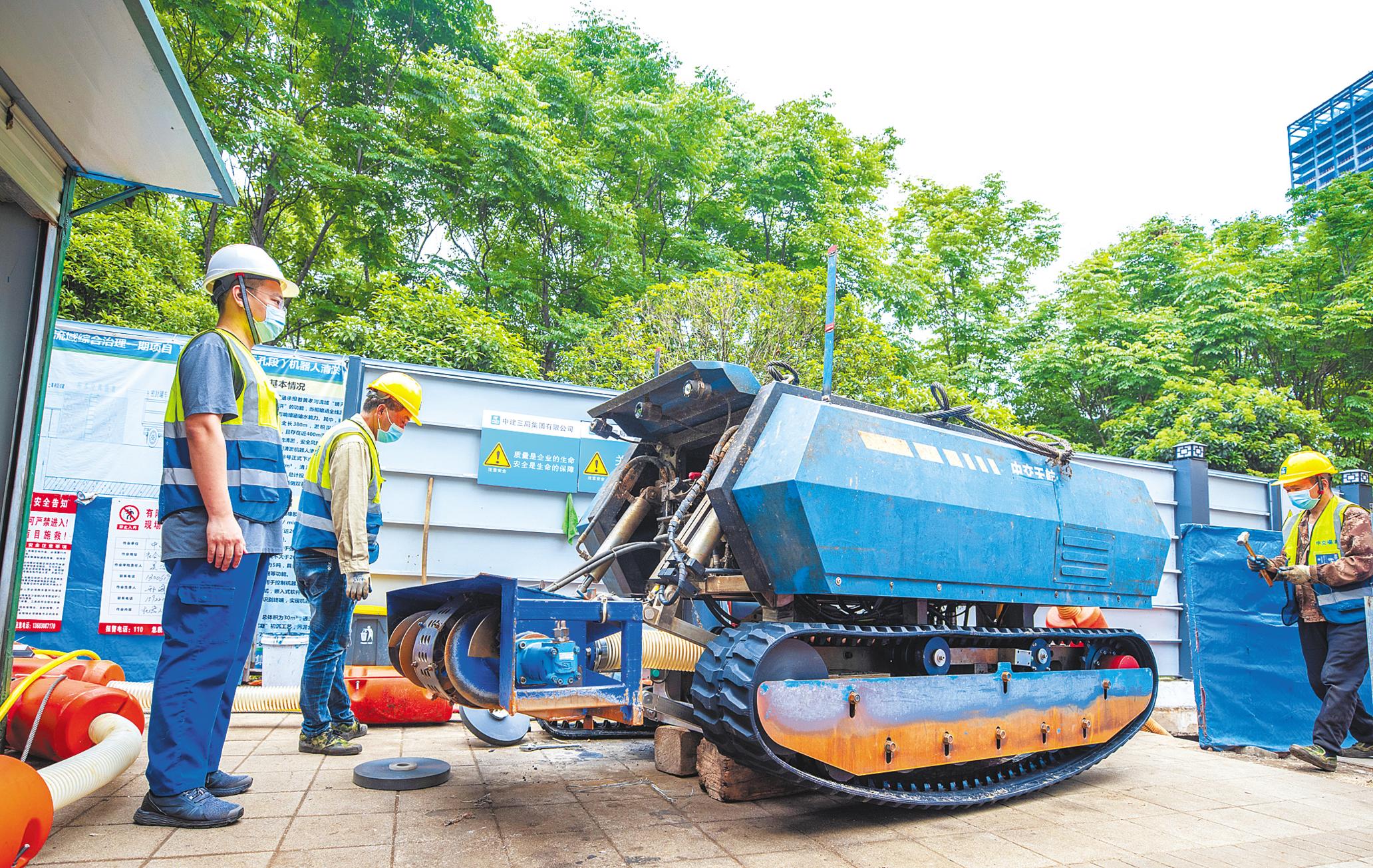 這就是中建三局綠投公司自主研發(fā)的巡檢機(jī)器人,配有“有限空間安全作業(yè)智慧管控系統(tǒng)”,還有“四竅”,即四個(gè)可轉(zhuǎn)換、以便調(diào)節(jié)暗涵內(nèi)空氣的通風(fēng)、送風(fēng)井;來水擋板,高強(qiáng)度鋁合金制成、能防瞬時(shí)涌水;智慧門禁,管控進(jìn)入暗涵作業(yè)人員身份等。目前,該公司正在二次研發(fā),進(jìn)一步提高機(jī)器人的性能,以適應(yīng)更多場(chǎng)景。