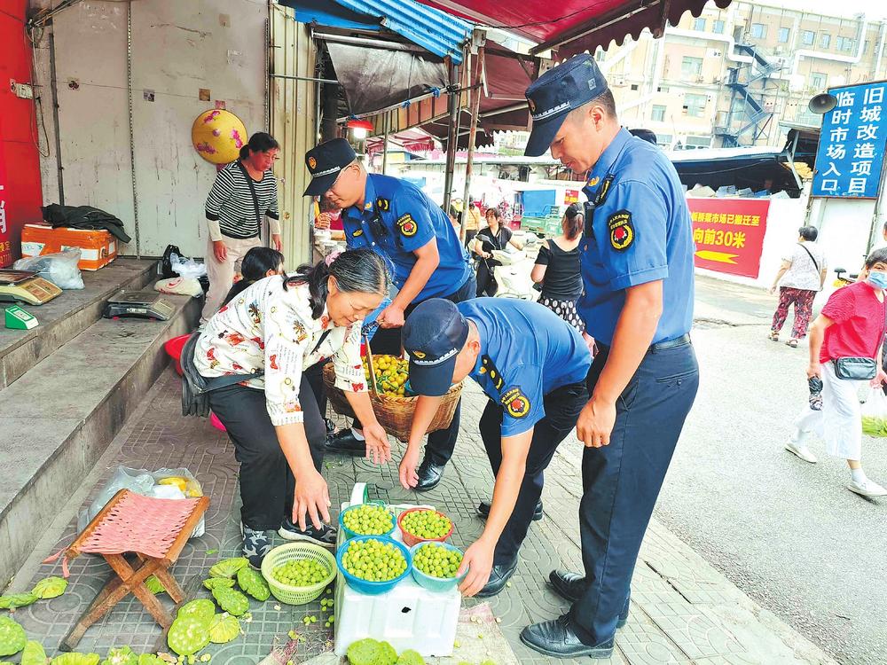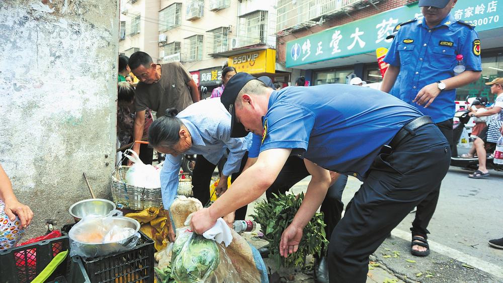 “我們采取延時、錯時,定人、定崗、定責的工作機制,安排執(zhí)法隊員錯時對農貿市場周邊及臨街門店開展逐一檢查,堅決杜絕部分商戶、流動攤販出店經(jīng)營、占道經(jīng)營和擺放遮陽傘阻擋過道等行為?!痹诮瘗樎繁眰然ò鍢虿耸袌黾盎B路周邊,區(qū)城管局五里牌中隊通過采用錯時執(zhí)法和取締一批、歸市一批、疏導一批的辦法,在花鳥路附近的南北樓設立臨時疏導區(qū),為自產(chǎn)自銷的菜農創(chuàng)造合法的經(jīng)營地點,通過耐心宣傳相關政策規(guī)定,主動幫助商戶搬移占道物品等文明執(zhí)法方式,工作得到廣大商戶和流動攤販的理解及市場周邊百姓的支持。