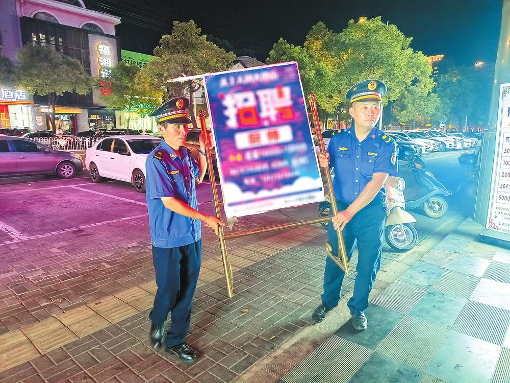 夏季是夜宵燒烤攤點店外經(jīng)營、流動瓜果散販增多的高峰季節(jié),使得夜間城市管理難度加大?!袄习?,廣告牌不能占道擺放,我們幫您搬進店內!”8月25日晚8點,夜幕來臨,在磨子山南路,路燈照亮了岳陽樓區(qū)城管委城管三大隊執(zhí)法隊員忙碌的身影,他們正在對夜間人流量較大、群眾反復投訴的重點難點路段和區(qū)域進行巡查管控,嚴防夜市出店經(jīng)營、露天燒烤、油煙污染及夜間施工場地揚塵污染、違規(guī)渣土車無證運輸?shù)葐栴}發(fā)生。