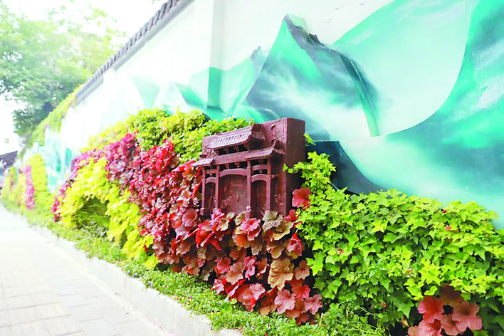 青山連綿,峰巒疊嶂,一幅新奇秀美的綠色“山水圖”在徽派風(fēng)格墻壁上綿延開來(lái),往來(lái)行人宛如走在青山綠水之中。