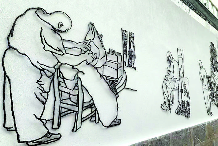 除了手繪壁畫,在北油坊巷東段入口處還有一面鐵畫墻。精湛的民間鐵畫技藝還原了市井百態(tài),城市民生最拙樸的風(fēng)貌得以展現(xiàn),讓老巷多了些煙火逍遙。