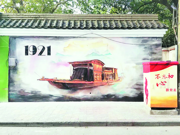 有一面墻上畫著1921年嘉興南湖上的“小舟”。那是孕育中國(guó)共產(chǎn)黨的地方,奔涌的水面上“紅船”穩(wěn)穩(wěn)航行,讓人感受到黨的堅(jiān)定與力量。