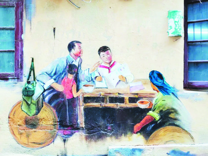 居民墻涂上上世紀(jì)80年代“民俗”主題墻繪,生火做飯的爺爺奶奶、買冰棍的小孩、看書的學(xué)生、帶著錄音機(jī)騎車飛奔的青年……這些栩栩如生的繪畫和屋檐下掛著的玉米、紅辣椒、大蒜、鳥籠等,給吳山巷增添了生氣和樂趣。路過的行人看到這些記錄著過往歲月經(jīng)歷的墻繪,不免回想起過去,感嘆現(xiàn)在生活的美好。