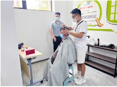 外賣(mài)小哥在清馨苑社區(qū)的新就業(yè)群體服務(wù)驛站免費(fèi)理發(fā)