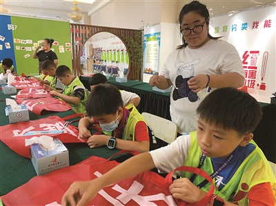 在下午的活動中,小記者們來到城管義工展廳,學習用廢棄的橫幅手工縫制環(huán)保袋,積極響應“低碳生活”的號召。許多小朋友都是第一次做針線活,但看到自己制作完成的環(huán)保袋后,充滿了成就感。