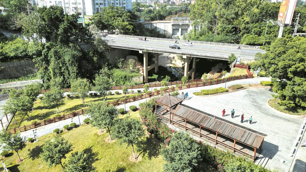 步道干凈整潔、河溝清水流淌、鳥鳴聲清脆悅耳……每天一大早,居住在城區(qū)維林市場(chǎng)的居民羅壽豐都會(huì)帶孫子到草鞋溝生態(tài)公園散步。這里樹木成蔭,綠草遍地,大小不一的鵝卵石錯(cuò)落鋪設(shè)在步道一側(cè),醒目的紅漆圍欄點(diǎn)綴著河溝兩岸的綠茵植被,一片秋意盎然。