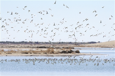 三五成群的遺鷗、赤麻鴨、黑翅長(zhǎng)腳鷸時(shí)而用翅膀拍打水面展翅飛翔,時(shí)而在水中嬉戲、覓食,一幅鳥集鱗萃的景象。