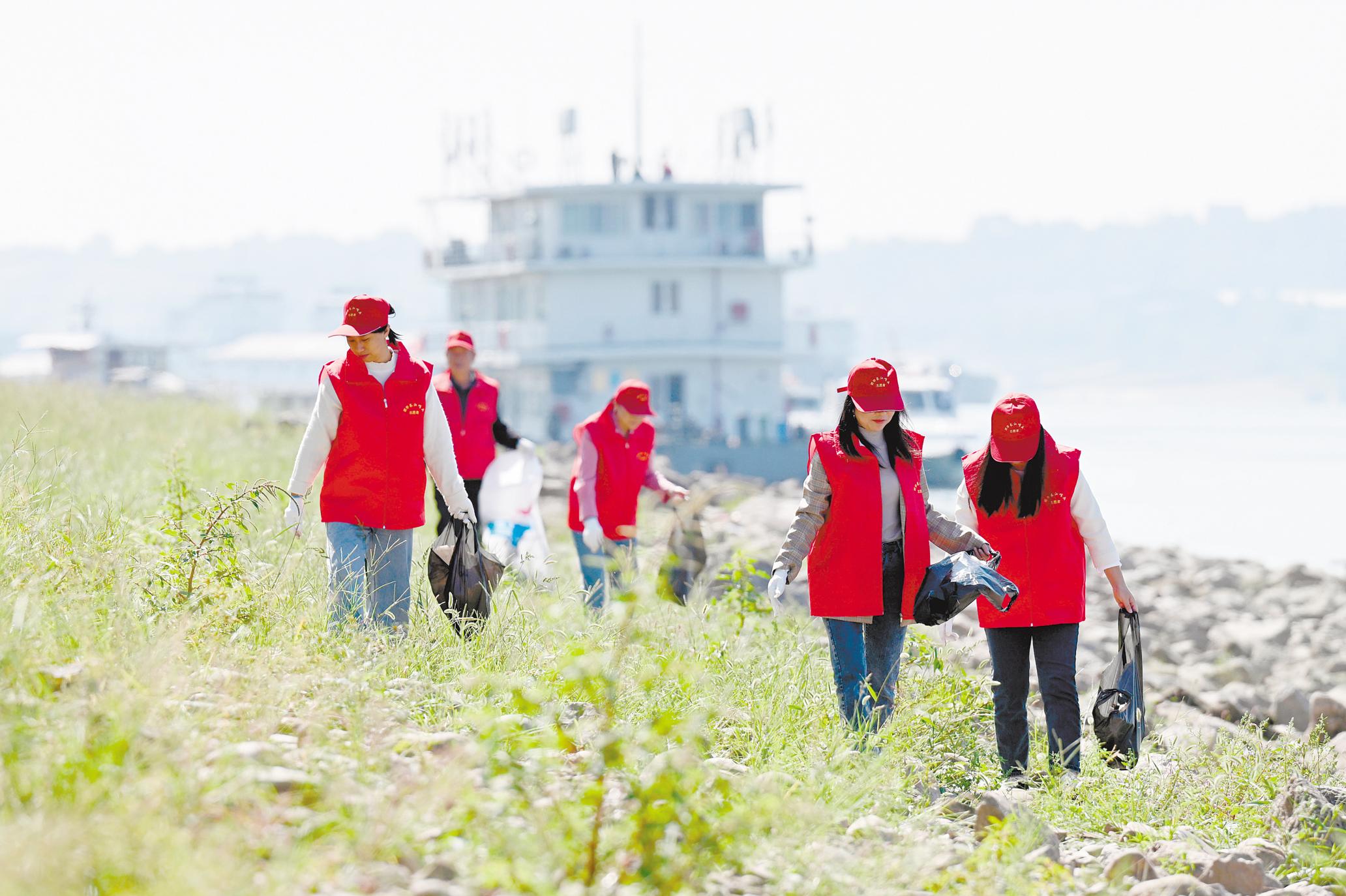 宜昌猇亭長江邊呵護長江岸線的青年志愿者。