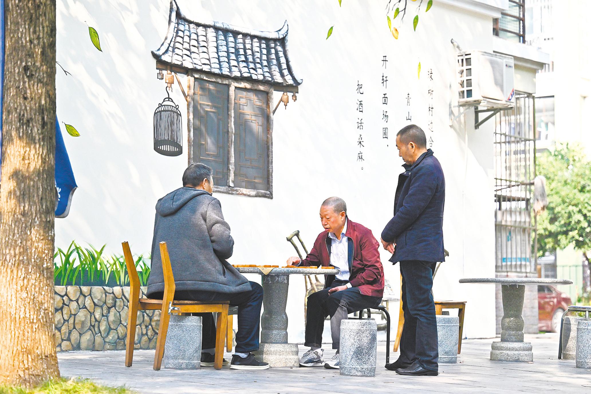 11月9日,都市田園小區(qū)居民共同締造的“文明都市溫馨田園”,市民在優(yōu)美的環(huán)境中下棋娛樂。