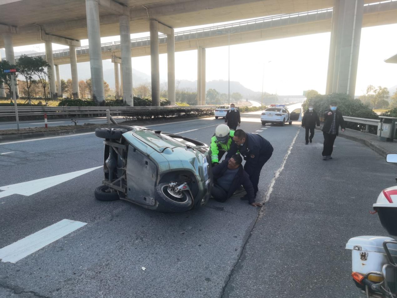 看到這一情景,正在后方行駛的隊員立刻靠邊停車,一位隊員立刻幫助疏解交通,指揮過往車輛注意避讓,其余兩位隊員跑上前去查看情況。隊員馮光盛第一個趕到側(cè)翻的三輪車邊,他發(fā)現(xiàn)駕駛員老大爺連連喊著:“痛、痛……”馮光盛打算將大爺從車底扶出,但發(fā)現(xiàn)其雙腿被壓難以直接拉出。隊員蔡善康趕緊喊路過的熱心群眾幫忙,此時交警和北侖區(qū)法院的工作人員路過也趕緊停下車跑來幫忙?!耙欢?!”在眾人合力下,三輪車很快被抬起,馮光盛立即將大爺拉出。隊員們將大爺扶到路邊休息,詢問傷情,剩下的人則合力將三輪車挪移至道路外的安全地帶。