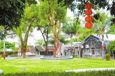 環(huán)境整治改造后的香樟園環(huán)境清幽雅致,功能齊全多樣:樹冠形成宛如穹頂?shù)摹罢陉杺恪?,下方便是圓形樹池座椅,可供居民和游客休憩、觀賞,往上橫街方向望去,一大片開闊草坪讓清新綠意盡收眼底。園內(nèi)還有一塊半圓扇形硬質鋪裝小舞臺,地磚雕刻有會同古村標志性的兩座閘門、三座祠堂和兩棟碉樓,將古村文化底蘊藏于細枝末節(jié)中。在這里可舉行小型音樂演奏會、朗誦比賽、村民議事等活動,豐富村民的精神文化生活。