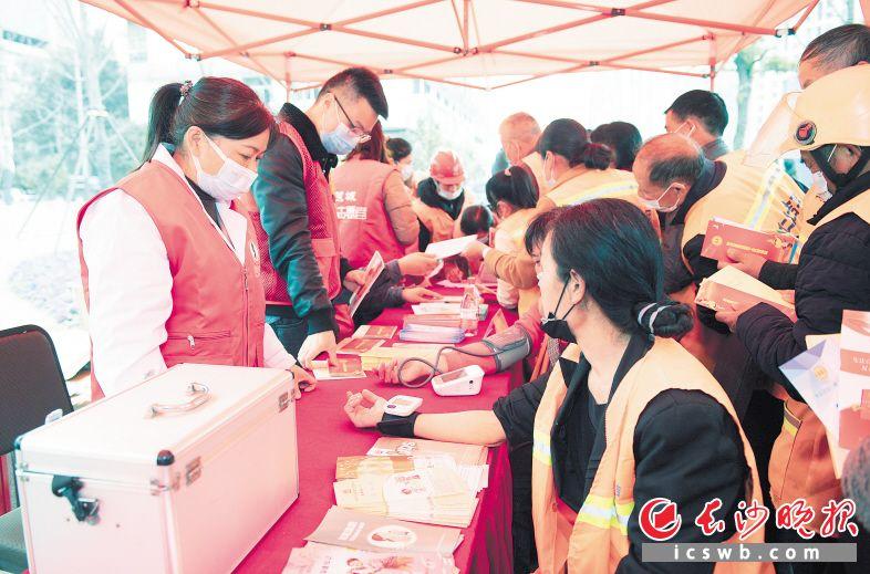 志愿者在免費給環(huán)衛(wèi)工人做體檢。記者 鄒麟 攝
