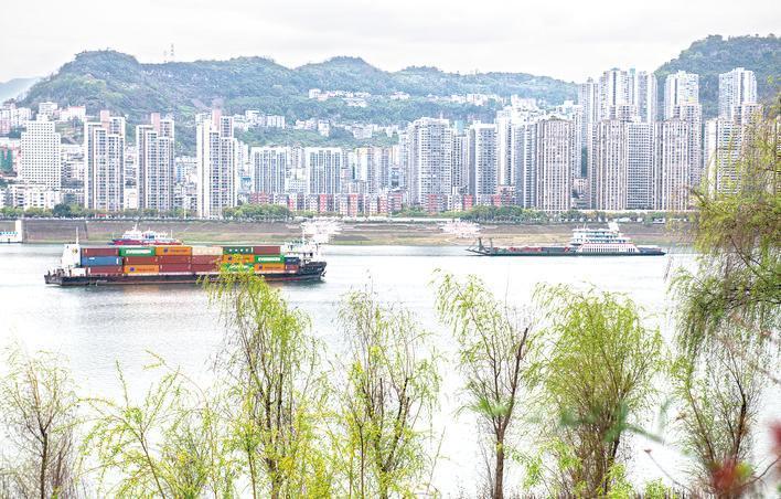 萬州區(qū)南濱公園,長江消落帶上綠色植被和過往船只交相輝映。冉孟軍/圖