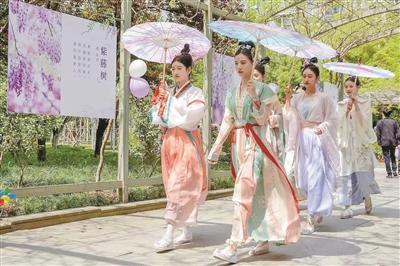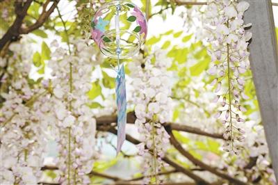 從拱門花架下穿行入園,一簇一簇淡紫色花串從棚架傾瀉而下,隨春風(fēng)飄蕩,與風(fēng)鈴發(fā)出的陣陣清脆相和;一群身著漢服的國(guó)風(fēng)女孩穿梭其間,演繹公園最靚麗的風(fēng)景線?!澳憧?,原來(lái)這些紫藤花有不同的名字,李白、白居易這些大詩(shī)人都為紫藤寫過詩(shī)?!奔易」珗@對(duì)面名城燕園小區(qū)的張銳帶著五歲的女兒來(lái)賞花,邊看還邊為女兒講解。