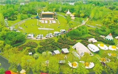 開幕首日便吸引了200萬市民游客線上線下參與。230頂各類帳篷分布于草坪和湖邊,來自全國137家參展商展出了約50輛房車、900余種各類露營裝備,以及1000余款鄉(xiāng)村文創(chuàng)特產(chǎn)商品。