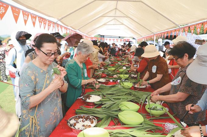 徐州市在大龍湖畔開展端午民俗文化、民俗產(chǎn)品展活動(dòng)。圖為包粽子比賽。李廣富 攝