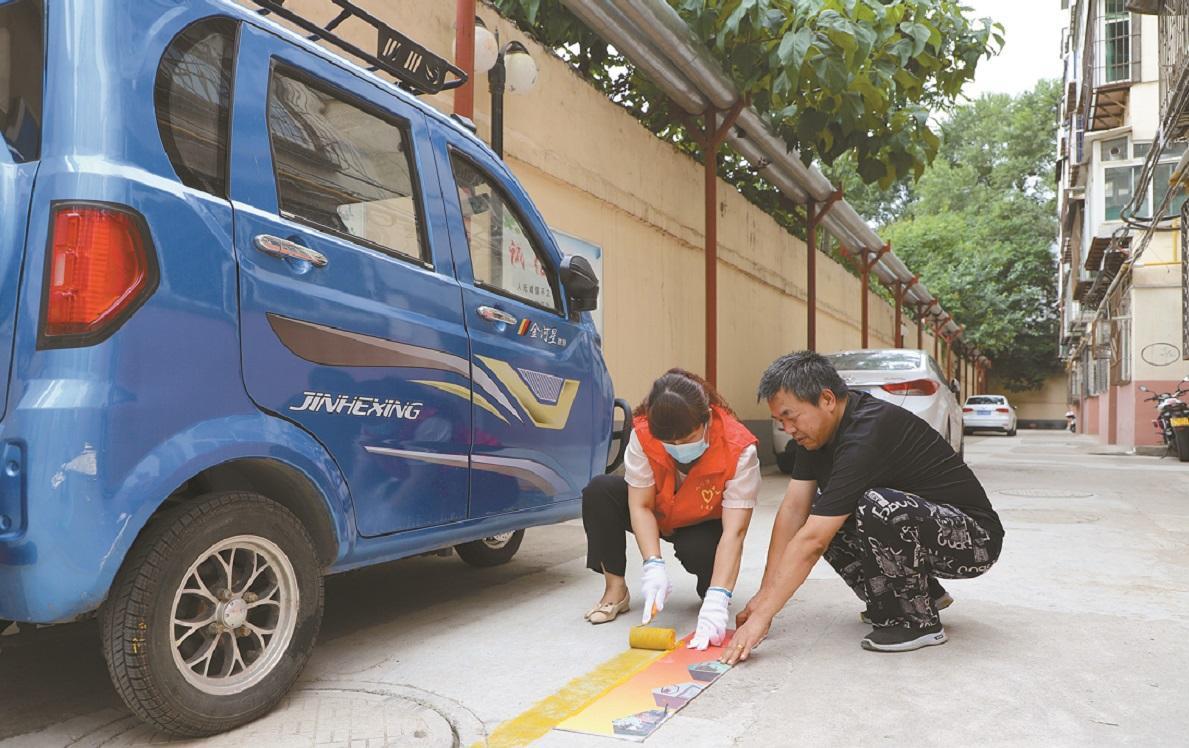 7月24日,銅川市王益區(qū)紅旗街街道辦事處志愿者上門為小區(qū)劃停車線。記者 楊光 攝