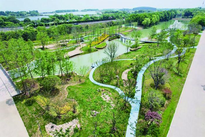 一方面,項目全面采用綠色源頭海綿設(shè)施,以減少城市徑流外排、減輕面源污染,同時滿足年徑流總量控制率和SS(固體懸浮物)去除率的相關(guān)要求。另一方面,充分利用原有河道自然風(fēng)貌,在河道兩岸布局雨水花園、植草溝、生態(tài)綠地等自然生態(tài)區(qū)域,營造優(yōu)美宜人的水景觀,打造具有經(jīng)開區(qū)特點的濱水景觀帶,發(fā)掘生態(tài)旅游潛力,為開發(fā)開放式、生態(tài)型的現(xiàn)代化新城打下扎實的基礎(chǔ)。此外,項目還通過水系連通等工程建設(shè),使清水河全線貫通順暢,進而解決經(jīng)開區(qū)向東排水問題,加快完善太湖新城水系網(wǎng),提高經(jīng)開區(qū)防洪減災(zāi)水平。