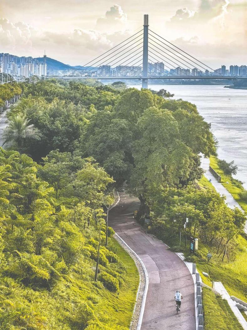走在綠道上,微風送來絲絲清涼,讓人神清氣爽,愜意無比。圖為市民在邕江南岸綠道上騎行。 記者 葉子榕 攝