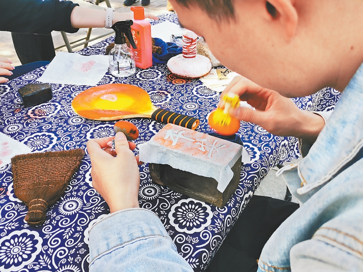 國慶期間,游客在八大處公園舉辦的活動中體驗(yàn)非遺傳承技藝拓印。記者 吳鏑 攝
