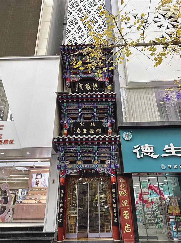 榫卯鑲嵌、手工木雕、精致彩繪、金箔貼邊,在張掖路步行街上,楊記眼鏡行的門樓招牌格外亮眼,雖然只有三四米寬的窄小門面,但店外從上而下的三塊古韻招牌彰顯出這家店的“不簡單”?!白钕旅孢@塊‘澤玉軒’的招牌是我家祖輩楊澤玉開創(chuàng)這家眼鏡行時留下的字號”,楊記眼鏡行是蘭州一家老字號的石頭眼鏡售賣和維修小店,光是制作修理石頭眼鏡這項手藝就已經傳到了第五代,其店鋪在二十世紀八九十年代就獲得過商務部的“中華老字號”認可。
