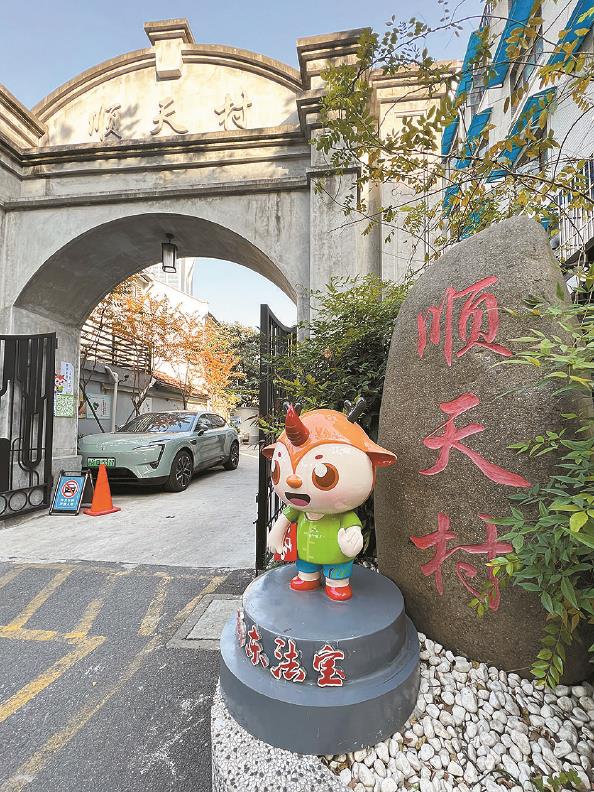 成都北路順天村大門(mén)口,站著一只卡通“法寶”。