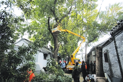 9點,斷接導(dǎo)線工作結(jié)束,胡同的高壓線纜“脫網(wǎng)”。緊接著,橘黃色的高架車開進胡同,將拿著油鋸的工人送上十幾米的高空,他們要對高壓線附近的樹冠進行修剪。