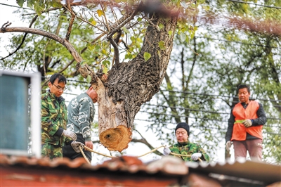 不遠處,幾名綠化工人踩在房頂上,將帶著墜物的麻繩拋到樹上,高架車上的工人捆好繩子,待吊車鉤住捆著樹枝的繩子后,再將其鋸斷,防止掉落砸到行人。