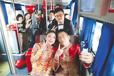 “結(jié)婚當(dāng)天,大家需要張羅的事很多,需要早起,會(huì)擔(dān)心司機(jī)疲勞駕駛,大巴車剛好就解決了這個(gè)煩惱。”去年12月28日結(jié)婚的李媛媛也選擇了大巴車迎親。她說(shuō),現(xiàn)在年輕人結(jié)婚,追求婚禮簡(jiǎn)約、熱鬧,大巴車安全又環(huán)保就成為他們迎親車輛選擇的重要考慮之一??吹揭灿泻芏嘈氯诉x用大巴車迎親,她和丈夫胡先生也有了嘗試的想法。誰(shuí)料想,這個(gè)提議得到雙方父母的贊同?!凹依锏挠H戚都很贊同,大家可以坐在大巴車內(nèi)互動(dòng)交流,氛圍非常好。”李媛媛說(shuō),與傳統(tǒng)迎親車隊(duì)相比,租用大巴車更加經(jīng)濟(jì)實(shí)惠。