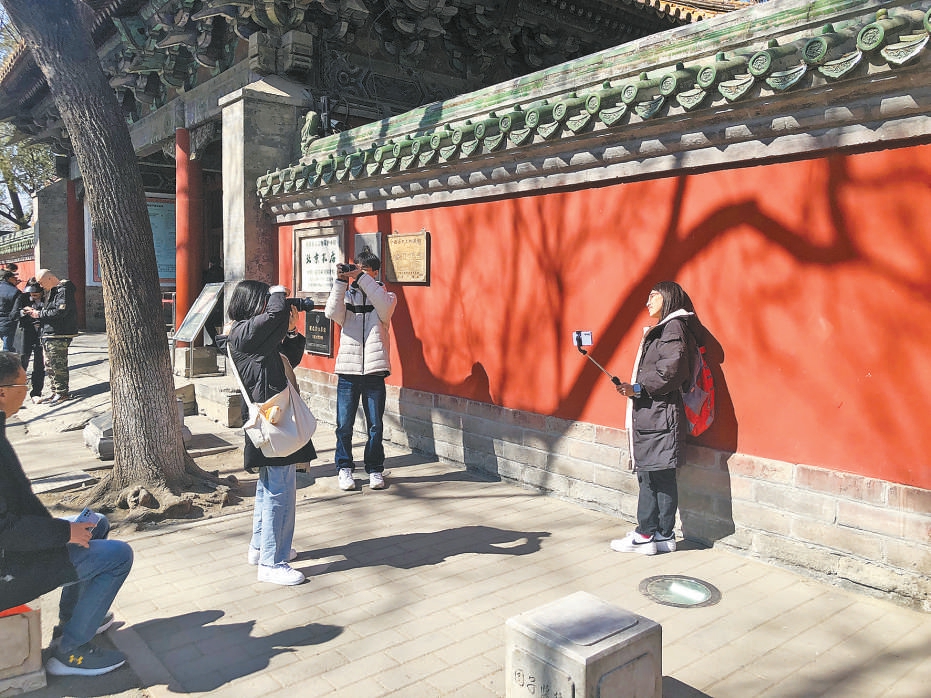 隨著天氣回暖,孔廟的紅墻下,打卡拍照的游客多了起來。