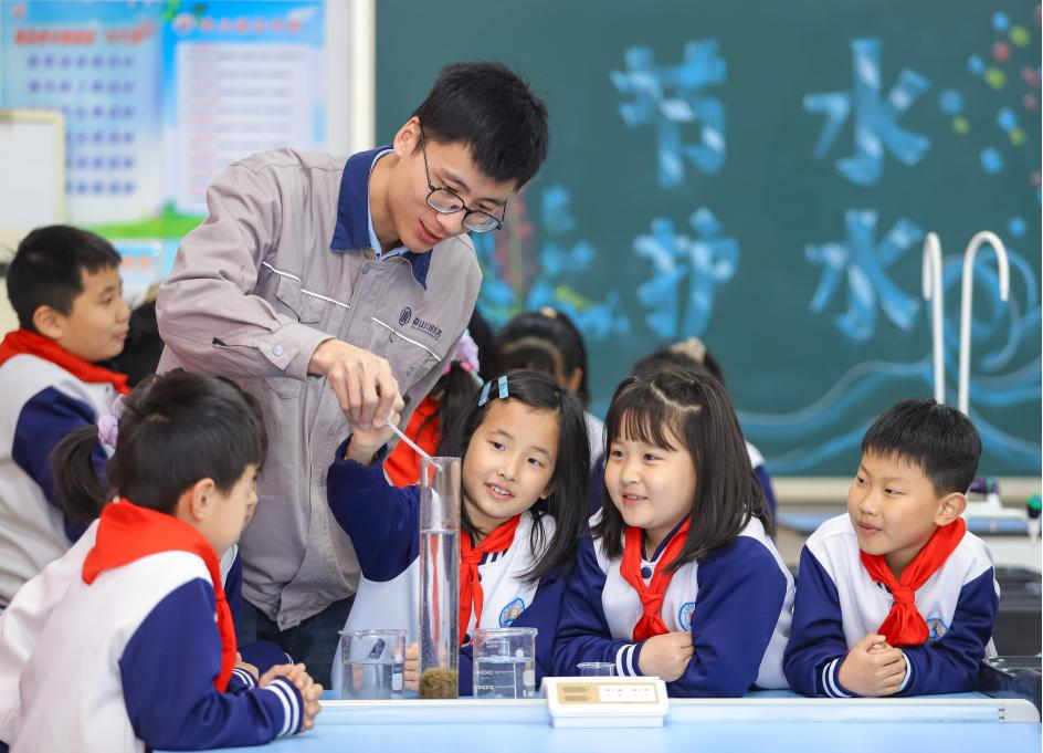 3月21日,在山東青島弘德小學(xué),污水處理廠講解員指導(dǎo)學(xué)生做實驗。