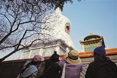 在北海公園白塔塔基周邊,栽種著20多棵山桃花。眼下春光明媚,桃花已悉數(shù)怒放,白中帶粉的花瓣清新唯美,吸引游客拍照。白塔映桃花也是攝影愛好者們的熱門題材,他們流連于此,拍下一張張國風(fēng)大片。游客賞花時可以到白塔下的攬翠軒打卡,這里推出了桃花形狀茶點、桃花口味冰淇淋和桃花拉花咖啡等文創(chuàng)餐飲。