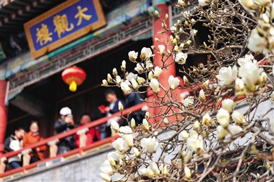 3月18日,北京大觀園,大觀樓前玉蘭綻放。記者 王飛 攝