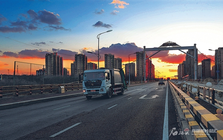 4月5日,落日余暉下,王秋云駕駛著清運車行駛在烏魯木齊經(jīng)濟技術(shù)開發(fā)區(qū)(頭屯河區(qū))金風大橋上。