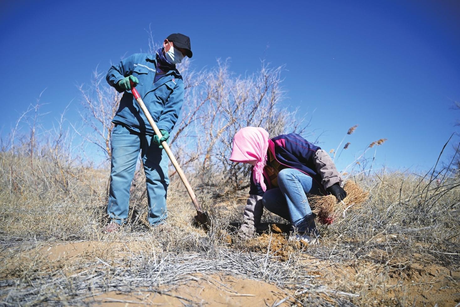 林場工人栽植檸條防沙固沙(3月20日攝)。
