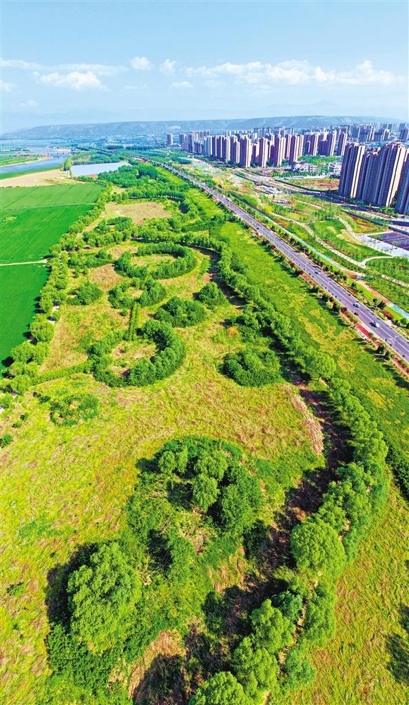 5月6日,無人機(jī)拍攝的渭南市渭河生態(tài)公園綠意盎然。 記者 杜瑋 攝