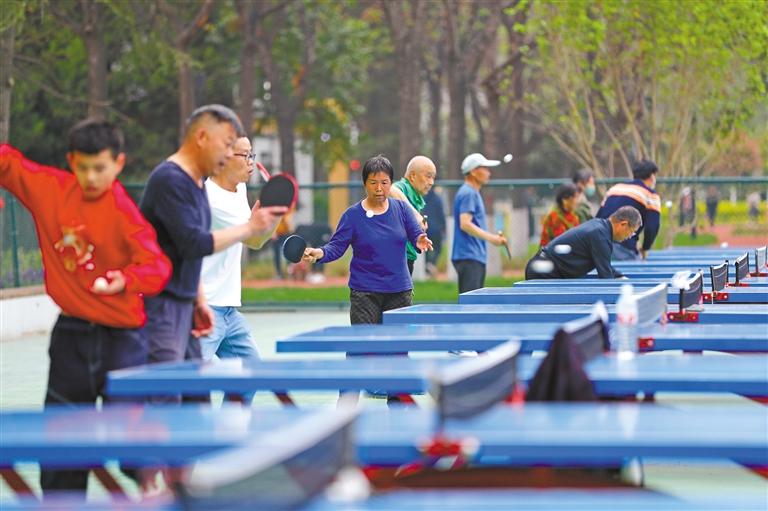 西安城市運(yùn)動公園是市民參與全民健身的重要場所之一。圖為5月7日,市民在西安城市運(yùn)動公園健身廣場打乒乓球。 記者 肖陽熠 攝