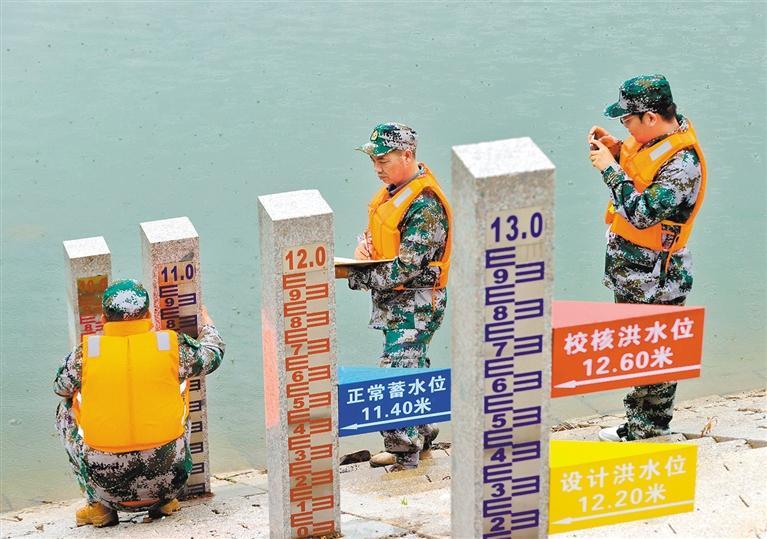 6月19日,在浙江省德清縣楊墳塢水庫(kù)水位標(biāo)尺處,工作人員在開(kāi)展防汛安全隱患排查。謝尚國(guó) 攝(中經(jīng)視覺(jué))