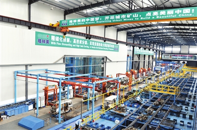 在這里,一輛報(bào)廢汽車被送上流水線,僅15分鐘就從整車變?yōu)樗槠F扑楹蟮臍堅(jiān)杆龠M(jìn)入分選流水線,自動(dòng)分類回收銅、鋁、塑料等材料,經(jīng)專業(yè)化處理可節(jié)能六成、節(jié)材七成,為下游企業(yè)提供低耗能、低排放、高效率的資源保障。