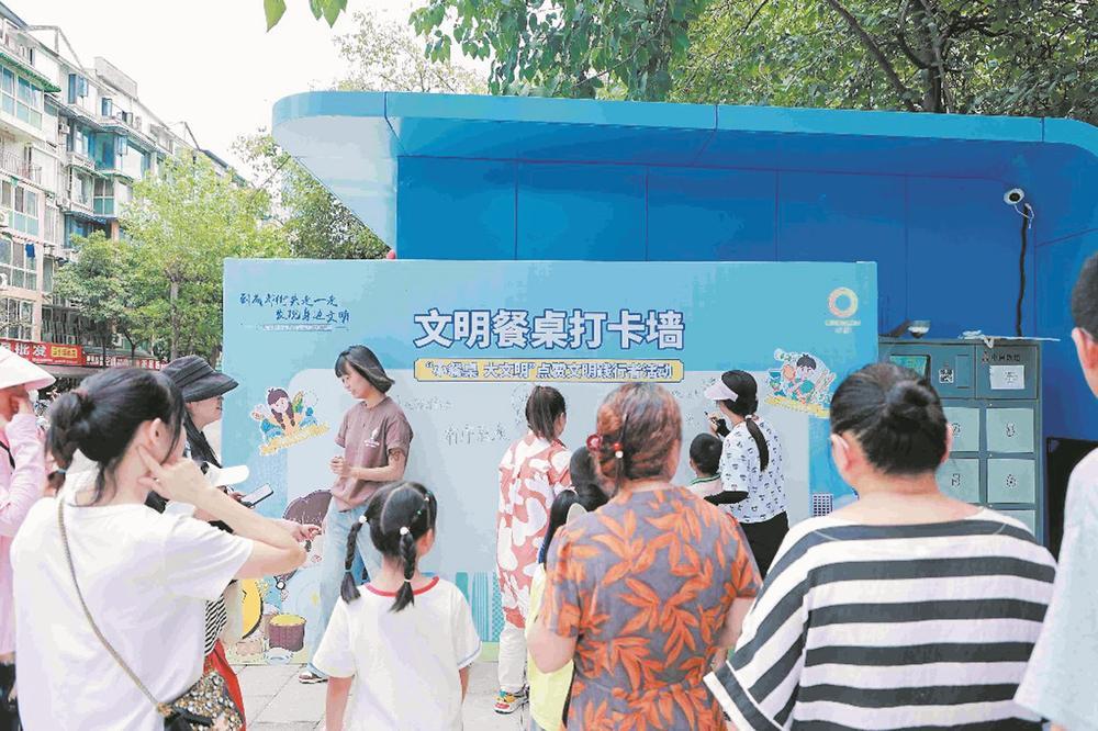 市民在文明餐桌打卡墻上簽名